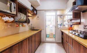 This type of kitchen is also called Galley kitchen, this modular kitchen layout features two working areas installed parallel to each other. Simply put, you have two benchtops facing opposite to each other on either sides of a central walkway. Best thing about having a parallel kitchen, is that it can help in easily segregating the tasks that you need to perform on each of the countertops, while moving in or out